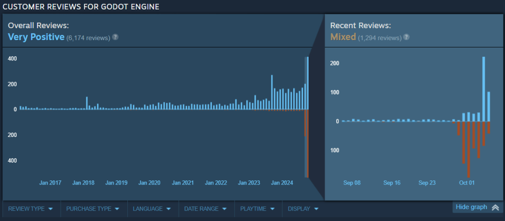With an overall review rating of Very Positive, to a recent review rating of Mixed, the damage has been done. The people review-bombing the engine consistently have less than 30 minutes in the engine, just enough to be able to post a review. They cite Godot being “woke”. These losers have nothing better to do that spew hatred and bigotry. They’ve been influenced by the right-wing, and so called “role-models” like Andrew Tate, and they believe anything that isn’t centered on their culture and themselves is “the woke mind virus”. They view our mere existence as a queer community as a threat, so they cry about it online.