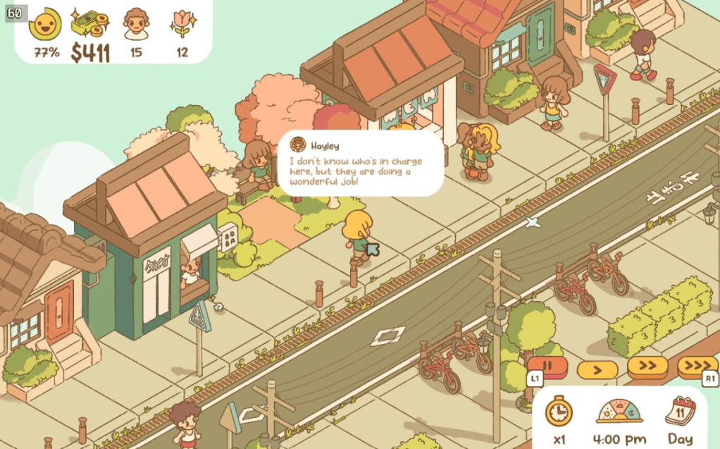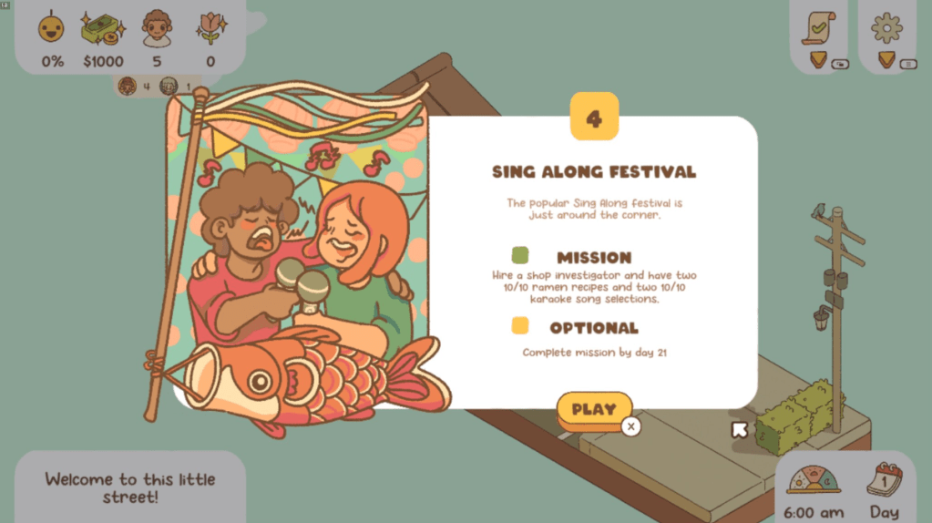 Minami Lane is a little piece of magic. In the game developed by Doot, Blibloop, and Zakku, and published by Wholesome Games Presents, you’re tasked by a tanuki to create the best little street you’ve ever dang seen. Every mission level you’re given a task such as “bring in more young folx to the community of septuagenarians.” Every day you’re given the opportunity to build one new building – whether that’s a new house for new villagers, a ramen shop, a karaoke bar, or the street service center – and you also get a chance to upgrade your existing building. Each day, villagers wander your street, eating lunch, going to the konbini, or grabbing flowers at the florist. As the day progresses you pick up trash on the street, pet cats, and… click on bicyclists… But, most importantly, you can click on each villager to see what they’re thinking. They’ll tell you they would prefer more noodles in their ramen, different items at the konbini, or how many books they just purchased, among a slew of personal thoughts – the product of great writing. There are 5 missions to complete, and a sandbox mode unlocked from the start.