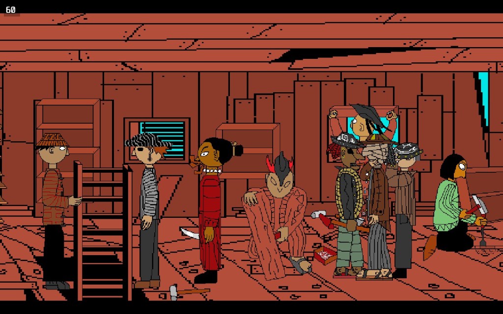 She’s the main character. She’s the main character we all like to envision ourselves as in our day to day life. But Cape Hideous makes us examine ourselves and forced me to determine who I would be on this ship. I’m not her. I’m no main character. I am the dude in the bottom of the ship who lends their flaming dagger to the main character so she can heat her cup of water (no spoilers here). There are so many incredible experiences and characters to come across in Cape Hideous. Each play through will take you 30-45 minutes. My first time took me almost an hour because I was just sitting and staring and watching animations and interactions. There’s something ineffable surrounding this experience. The line-heavy artwork, the angles, the subtle animation loops, they all come together to make you want to just sit and soak in it. It sucked me into its world immediately and had me wildly enthralled from minute one. I loved watching our character spin her knife on her finger. I loved watching the hammerers hammer and the sewers sew. I loved seeing the intricacies of a tight-knit community all cog-and-wheel together to make something magical. I got the sense that every character has some kind of relationship with another. These folx are real. I mean literally. They exist outside of us experiencing them. They exist outside of us perceiving them. That’s what we’re doing when we “play” Cape Hideous. We’ve been given a voyeuristic look into a living and breathing community. And yes, these “people” are made up of ones and zeroes on our hard-drive. But they exist. And they will continue to exist outside of our input and perception. I truly believe that. I believe that somewhere, in some universe, the guy with a million piercings is eating a bowl of soup aboard this ship and thinking about what he’ll do the next time they pull into shore and dock up for re-supplies.